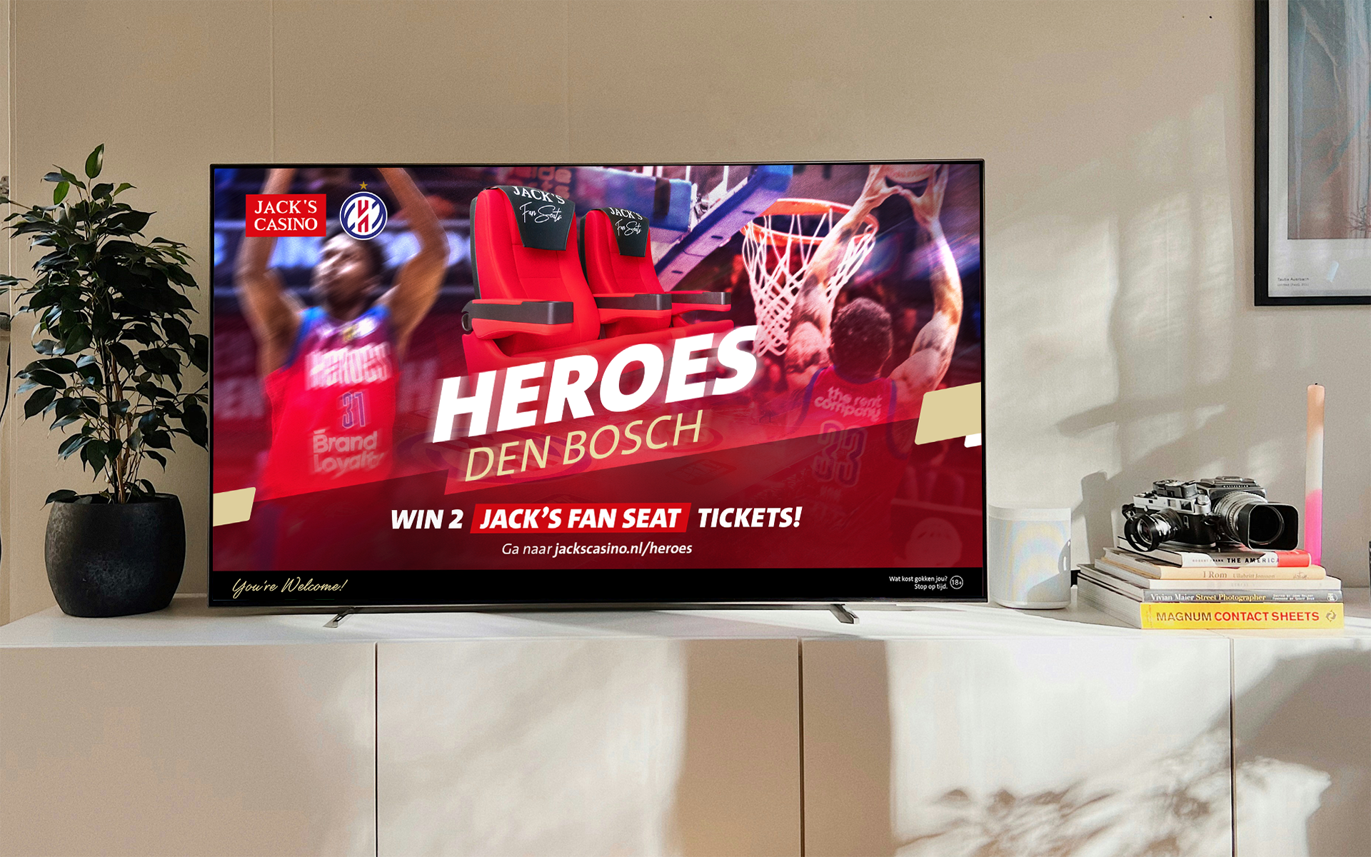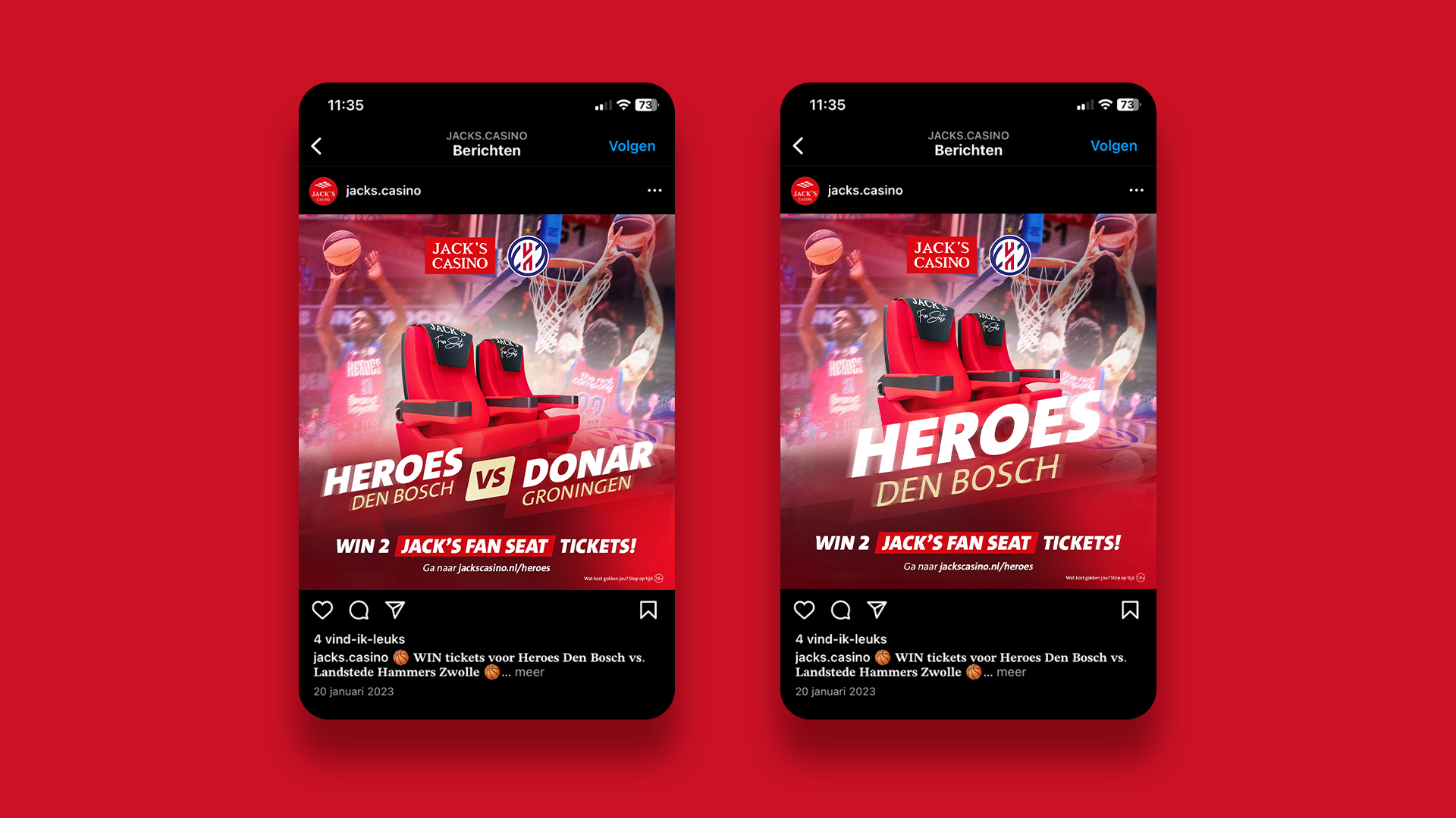 De combinatie van de sportieve spelers van Heroes Den Bosch met verwerking van de krachtige rode kleur van Jack’s Casino, zorgt voor een creatieve, herkenbare en opvallende visual die de aandacht van de actie versterkt.